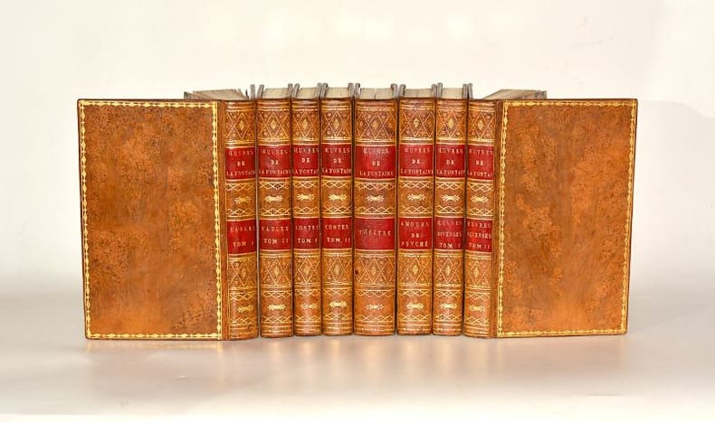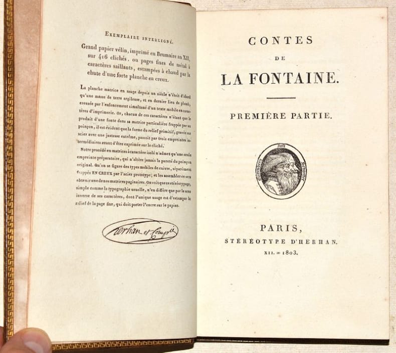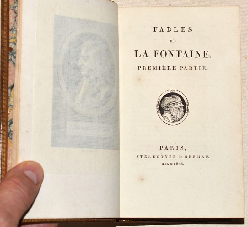 ÉDITION ORIGINALE de cette REMARQUABLE ÉDITION STÉRÉOTYPE des "Oeuvres complètes" de LA FONTAINE, réalisée d'après le procédé de Louis-François HERHAN (1768-1854) et dont les huit volumes se vendaient séparément chez Antoine-Augustin RENOUARD. Il s'agit, d'après Rochambeau, de la TROISIÈME ÉDITION DES OEUVRES COMPLÈTES DE LA FONTAINE, après celle en 3 volumes in-quarto publiée à Anvers en 1726 (incomplète du quatrième volume qui n'a jamais paru) et celle de Didot en 8 volumes au format in-18, commencée en 1799 et qui ne fut achevée qu'en 1814. « Exemplaire interligné. Grand papier vélin, imprimé en Brumaire an XII, sur 496 clichés, ou pages fixes de métal à caractères saillants, estampées à chaud par la chute d'une forte planche en creux » (Mention au verso du faux-titre du premier volume, les autres volumes portant des indications identiques excepté pour la date et le nombre de clichés utilisés). Rochambeau signale que cette édition a été en même temps imprimée au format in-18 sur « papier fin d’Essone ». PORTRAIT gravé de l'auteur d'après Augustin de SAINT-AUBIN (1736-1807) en frontispice du premier volume et VIGNETTE de titre répétée pour chaque volume représentant les profils de trois fameux imprimeurs du XVIe siècle : Johannes GUTENBERG, Johann FUST et Peter SCHOEFFER. (Rochambeau, "Fables", 178 - "Contes", 113 - "Théâtre", 28 - "Les Amours de Psyché et de Cupidon", 31 - "Oeuvres diverses", 61 - voir aussi page 640, n°3 des "Oeuvres complètes"). RAVISSANT EXEMPLAIRE, complet de l'intégralité des 8 volumes, conservé dans une jolie reliure d'époque en veau décorée. NICE COPY. PICTURES AND MORE DETAILS ON REQUEST.