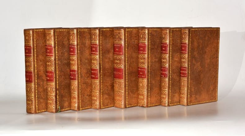 1803 Paris, Stéréotype d'Herhan, 1803-1804. Huit volumes in-12 (197 X 129 mm) veau fauve marbré, encadrement de guirlande et filet dorés sur les plats, dos lisse cloisonné et entièrement orné de filets, fers et fleurons dorés, pièces de titre maroquin rouge, coiffes et coupes filetées or, chasses ornées d'une grecque dorée, tranches dorées (Reliure de l'époque). Volume I : Portrait-frontispice, XXXVIII-148 pages - Volume II : (2) ff. de faux-titre et titre, 149-402 pages, (2) ff. dont un blanc - Volume III : XI-172 pages - Volume IV : (2) ff. de faux-titre et titre, 173-404 pages, (2) ff. dont un blanc - Volume V : (3) ff. de faux-titre, titre et avis sur cette édition, 388 pages, (2) ff. dont un blanc - Volume VI : XIV-290 pages, (2) ff. dont un blanc - Volume VII : (2) ff. de faux-titre et titre, 214 pages, (2) ff. blancs - Volume VIII : (2) ff. de faux-titre et titre, 217 -412 pages, (2) ff. dont un blanc. Accrocs à l'une des pièces de titre du volume "Théâtre" avec petit manque d'or à la lettre « H », quelques pointes de rousseurs, très éparses.