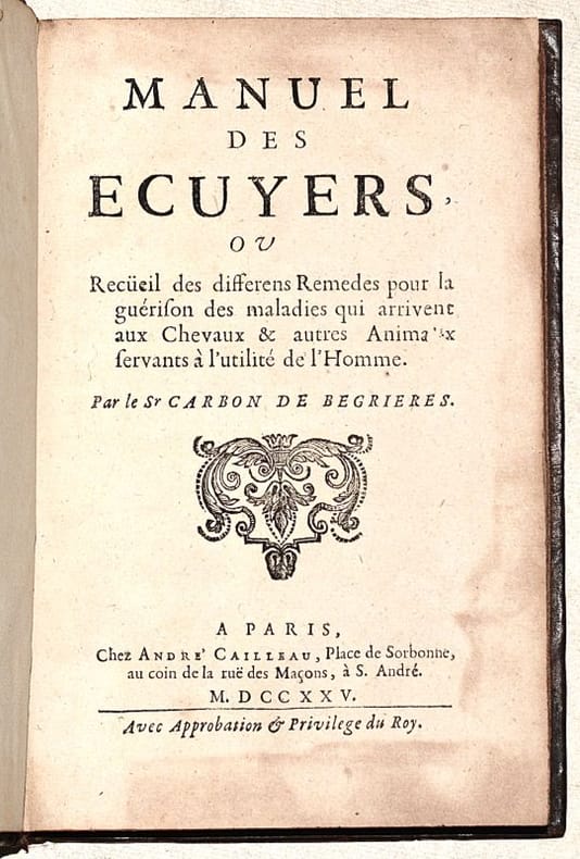ÉDITION ORIGINALE de cette RARE PUBLICATION rédigée par Jean-Baptiste CARBON DE BEGRIÈRES, capitaine de cavalerie, ancien écuyer du duc de Mantoue. « Sauf 2 pages sur le mulet et l'âne, l'ouvrage traite exclusivement des maladies du cheval, et il n'y est pas question des "autres animaux" indiqués au titre. » (Mennessier de La Lance, I-211). DE LA BIBLIOTHÈQUE DU CHÂTEAU DE CHATILLON (ex-libris). BEL EXEMPLAIRE conservé dans sa reliure d'époque, intacte. NICE COPY. PICTURES AND MORE DETAILS ON REQUEST.