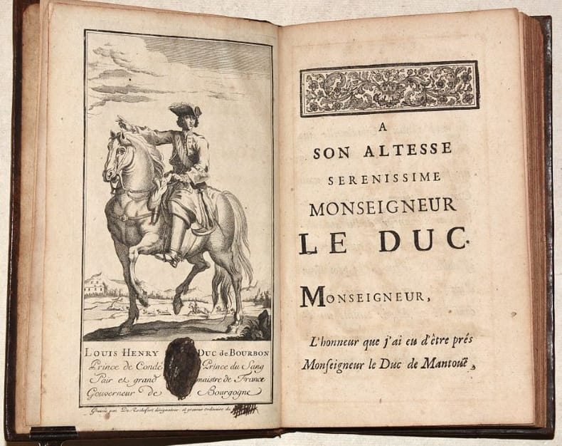 1725 Paris, Cailleau, 1725. In-8 (193 X 128 mm) veau brun granité, dos à nerfs orné de fleurons et fers dorés, pièce de titre maroquin grenat, tranches mouchetées en rouge (Reliure de l'époque) ; (5) ff. de titre, frontispice, epistre et catalogue, 205 pages, (3) pages de privilège. Le blason du duc de Bourbon en marge inférieure du frontispice ainsi que la mention « Roy » en-dessous ont été caviardés à l'encre noire, décharge brune (colle des gardes de la reliure ?) en marge de la page de titre. Ex-libris héraldique « Château de Chatillon » collé au premier contreplat.
